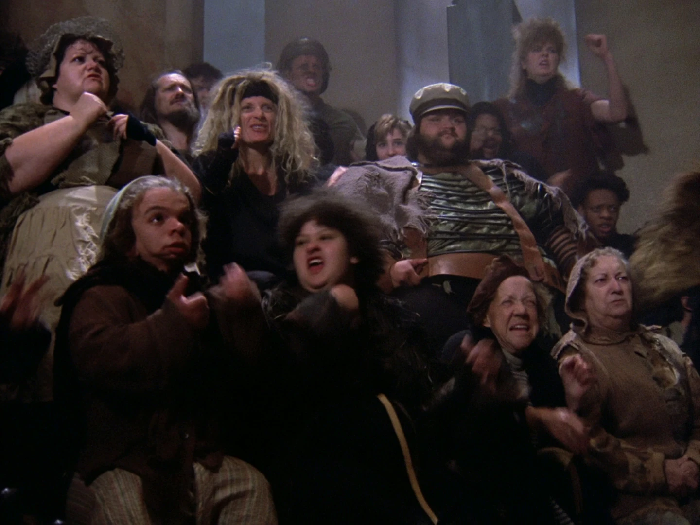 [ They were alone before, but now there is a roar - braying and laughing, jeering and shouted insults - from a vast crowd of dirty and disheveled looking onlookers. Q raises them in concert, then lowers his hands to quiet them, turning to look over his shoulder. ]